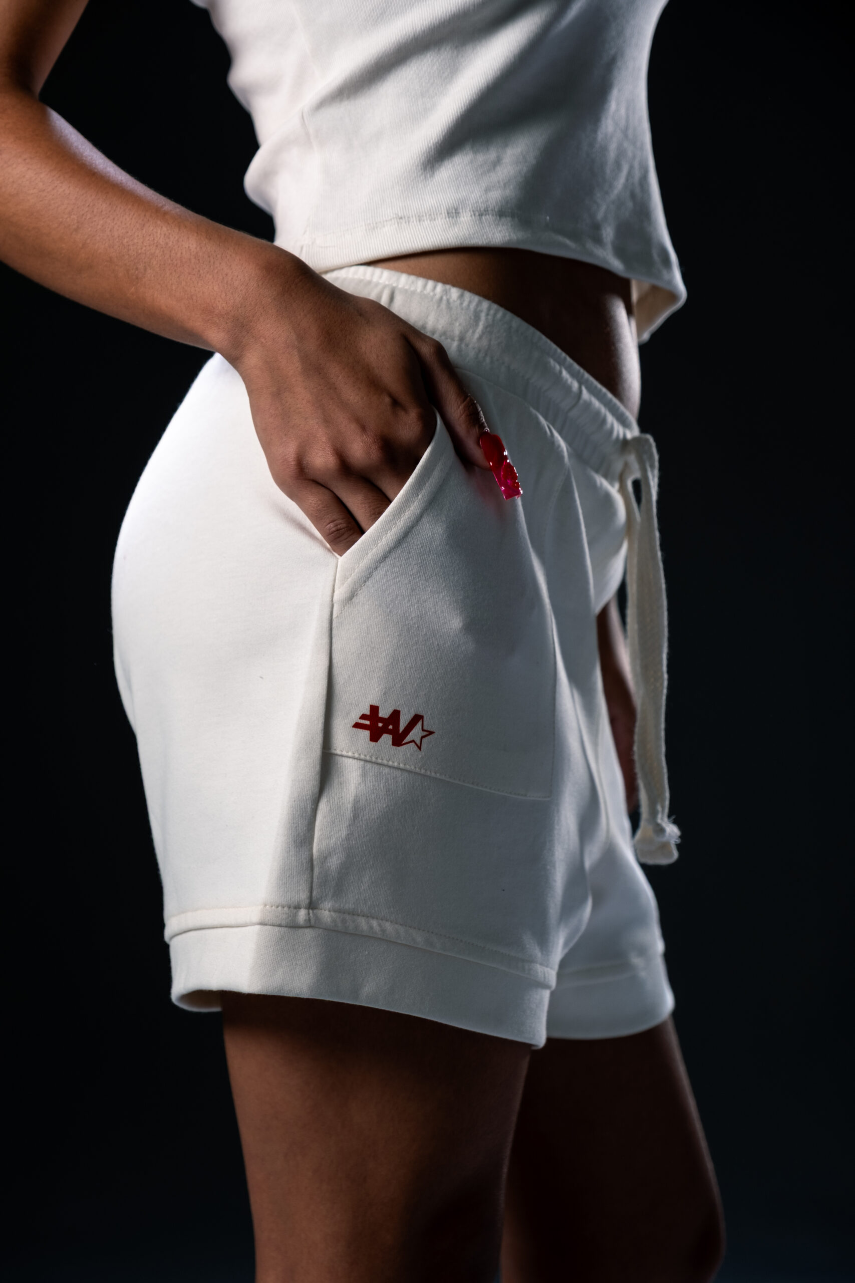 Bermuda feminina em malha Soft Double com cós em elástico e cordão, bolsos quadrados frontais sobrepostos.