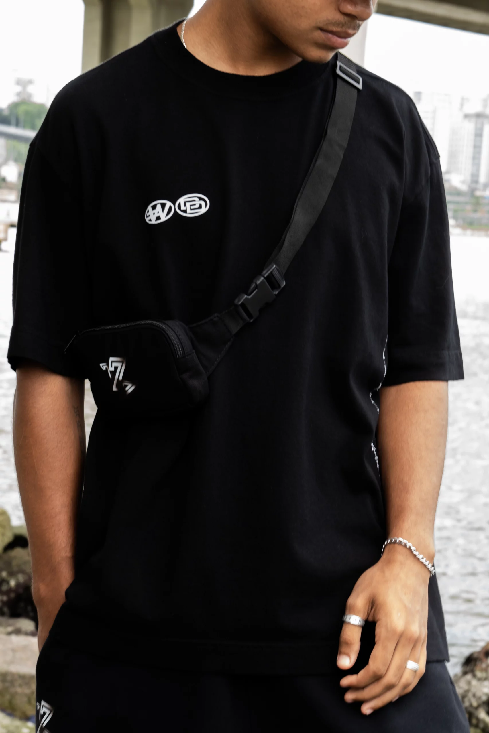 Shoulder bag mini na cor preta desenvolvida em 100% algodão (sarja). Possui compartimentos adicionais internos e revestimento em espuma. Fechamento com zíper. Alça em gorgurão com fivela plástica e reguladores de tamanho. Pode ser utilizada na transversal ou cintura. Estampa termocolante aplicada.